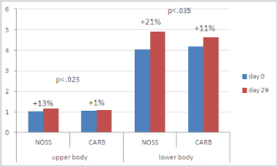 Figure 4: Changes in upper and lower body strength (in kg/kg body weight during bench press and leg press at 1RM) after 16 strength training sessions in 28 days with either 54g of maltodextrin or 27g of NO Shotgun and 27g of NO Synthesize pre- and postworkout (Willoughby. 2011) |
